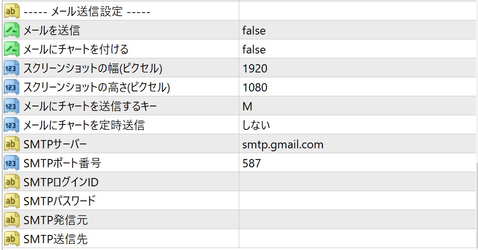 チャートのスクリーンショットを送る場合は、「メールにチャートを付ける」を「true」に設定します。